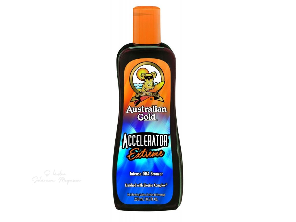 Naša ikonická opaľovacia zmes je teraz super nabitá! Telový opaľovací krém do solária s bronzerom pre urýchlenie opálenia. Vzájomná kombinácia DHA a 5-tich prírodných bronzerov vytvára úžasné okamžité výsledky a tmavšiu, dlhšie trvajúcu farbu. Exkluzívna zložka Biosine Complex® je nositeľom živín, ktorej zvlhčujúce a ochranné prvky pomáhajú udržiavať pokožku maximálne hydratovanú. Extrakt Echinacey je zmiešaný s prírodnými austrálskymi olejmi, vitamínom A a E a pomáha tak chrániť pred vonkajšími vplyvmi životného prostredia. Nadväzuje na popularitu názvu Accelerator, pokračuje v expanzii cenovo výhodných AG produktov a prvýkrát bolo v rámci tejto formule použité DHA. Unisex produkt je vhodný pre pokožku so základným opálením k intenzívnej stimulácii produkcie melanínu a pozvoľnému prechodu na maximálny stupeň opálenia a tiež na udržanie už dosiahnutého stupňa opálenia. Ako urýchľovač opálenia sa môže používať aj na pokožku bez základného opálenia u toho typu pokožky, ktorý sa ľahko a dobre opaľuje a nevykazuje známky alergických a problematických reakcií.